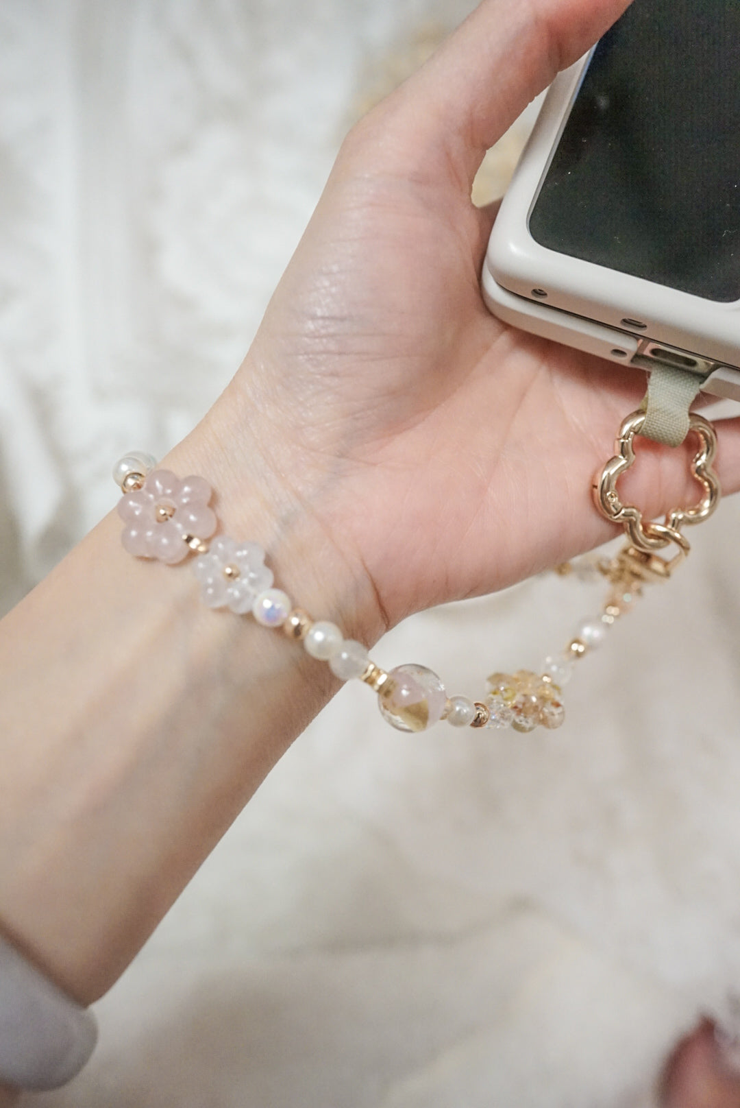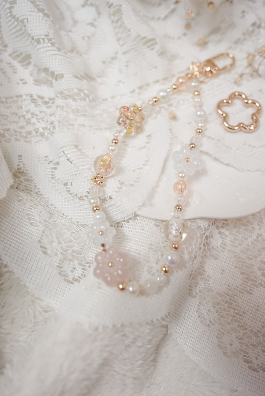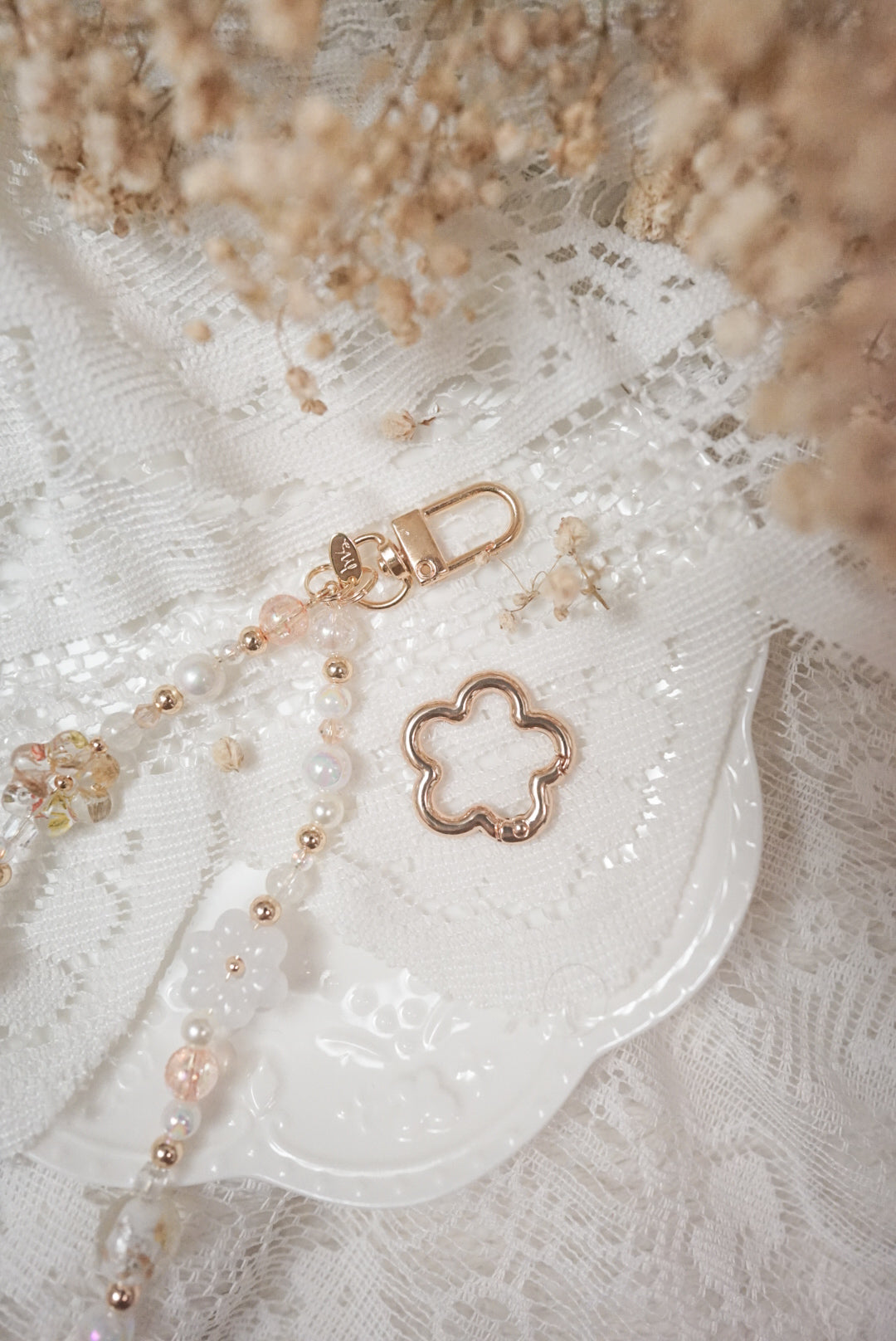 粉嫩奶茶色調串連夢幻花朵與珠飾,