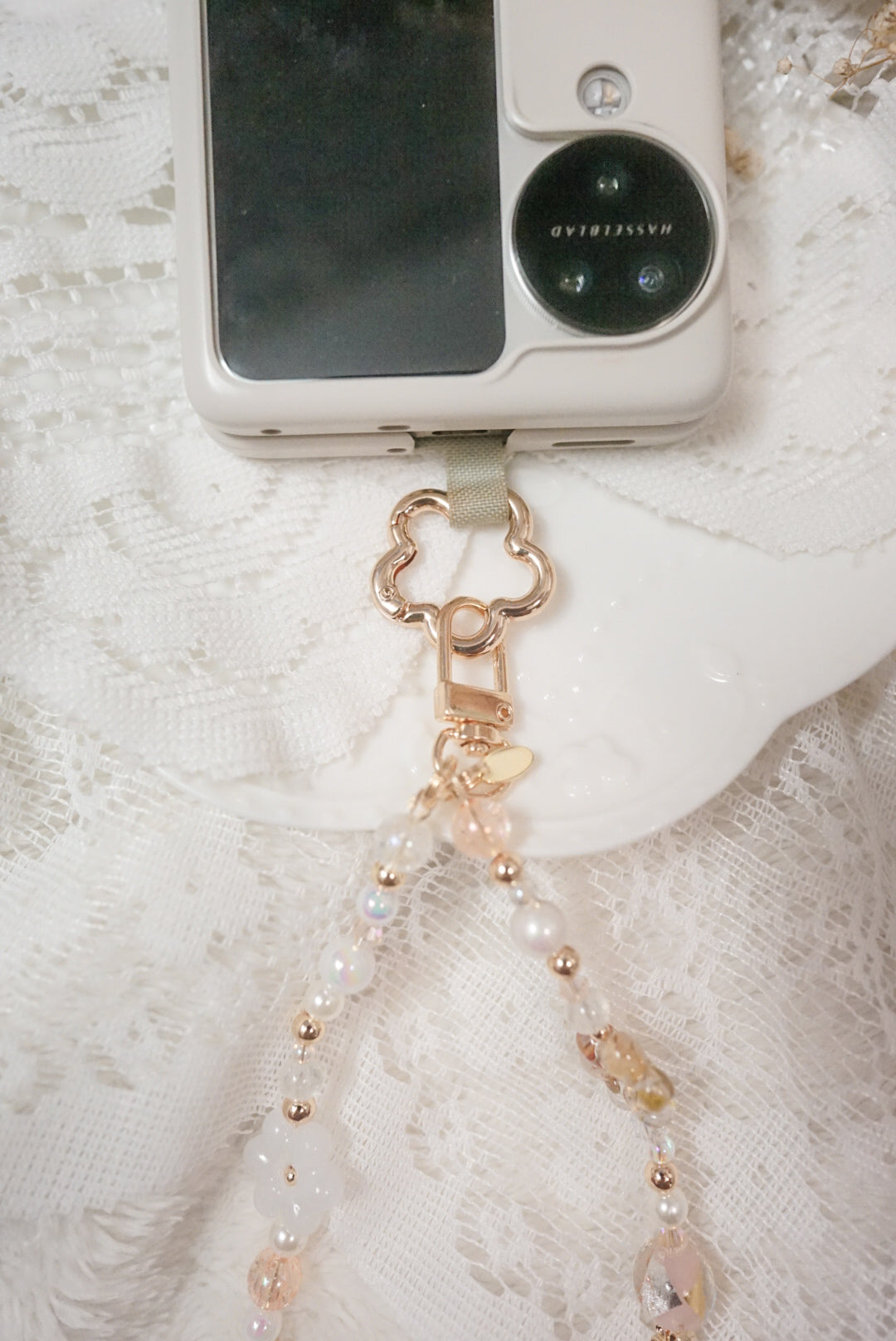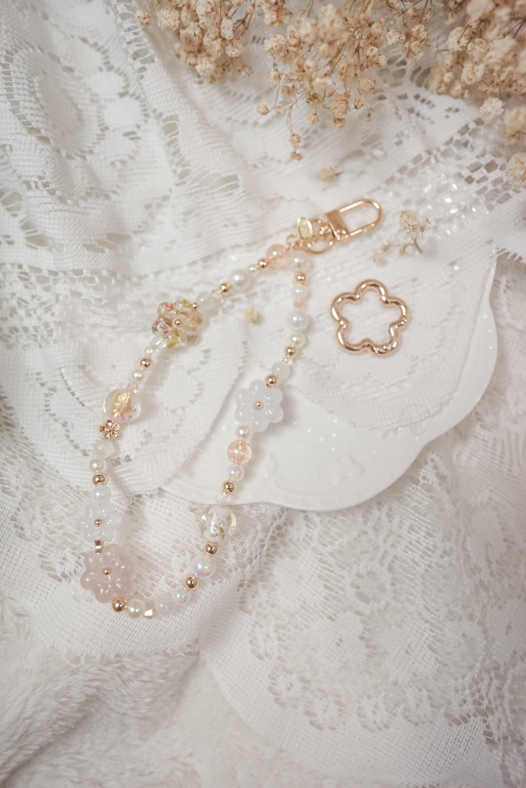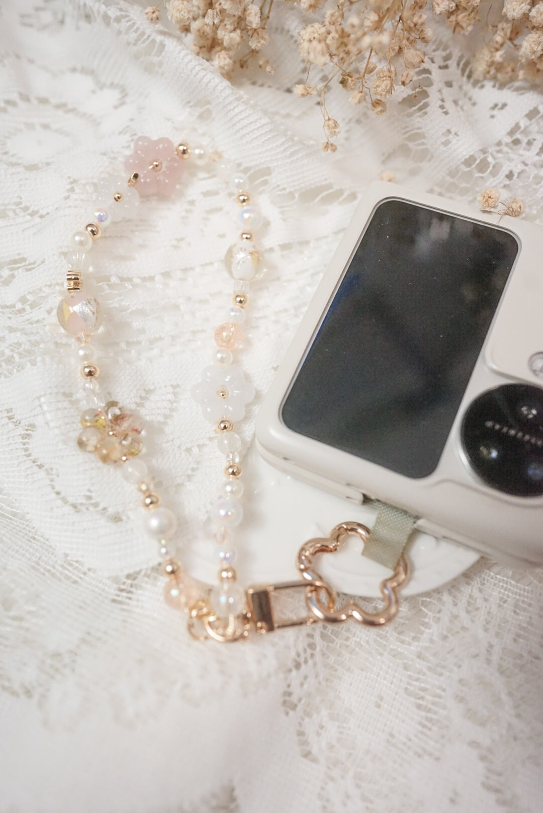粉嫩奶茶色調串連夢幻花朵與珠飾,